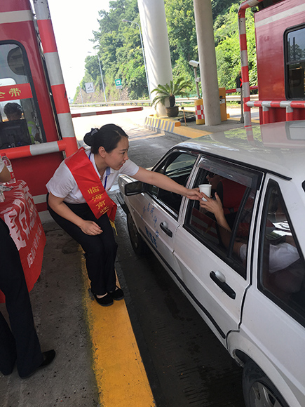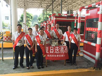 圖為工作人員合影 活動當天,該所在車道安全島內搭起臨時“便民服務臺”,不僅免費為司乘人員提供綠豆湯、礦泉水等消暑食品,還備足藿香正氣水、風油精、清涼油、花露水等解暑降溫藥品?;顒又?,大家身披橫幅,面帶微笑,向途經(jīng)收費所的司機遞上一杯杯綠豆湯、一瓶瓶礦泉水。同時,大家還不忘宣傳行車安全注意事項,提醒司機朋友在高溫酷暑時節(jié)多注意安全。司機朋友們不時露出欣喜的笑容,連連稱謝。 臨海南收費所通過開展“夏日送清涼”活動,不僅給廣大司乘人員在酷暑中送去絲絲涼意和關心,更加促進了收費員與司乘人員之間的溝通交流,拉近距離,從而贏得了過往司乘人員的好評,塑造了良好的窗口形象。 陳瑩
