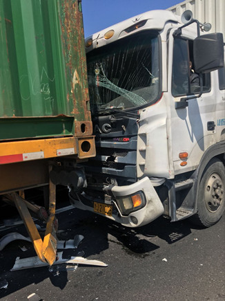 上圖為事故車輛 當天中午,在副站崗亭旁站的工作人員發現該所前方出口不遠處有貨車停在那里不動,以致后面車輛無法通行。工作人員隨即跑到前方查看情況,原來是三輛貨車發生追尾,其中有一輛車車頭被撞得凹陷,擋風玻璃也被撞碎,在了解事故現場無人員受傷后,工作人員馬上向監控中心匯報情況。由于事故車輛較大面積滯留,導致后方車子堵到主線上,一些不明情況的駕駛員在車里使勁按喇叭催促,現場充滿焦躁情緒。 如何盡快疏通道路?正在食堂吃飯的一班班長潘慶耀放下碗筷跑到事故現場,同工作人員叫前面受損較少的事故車輛先把車子開出收費站,再讓第三輛受損嚴重的車子試著發動車子開出去,所幸三輛車子都能開離車道。在將地上的破損碎片清理到車道兩旁后,工作人員繼續指揮車輛向前行駛,收費內廣場在較短時間內恢復了正常通行。 沈芬芳
