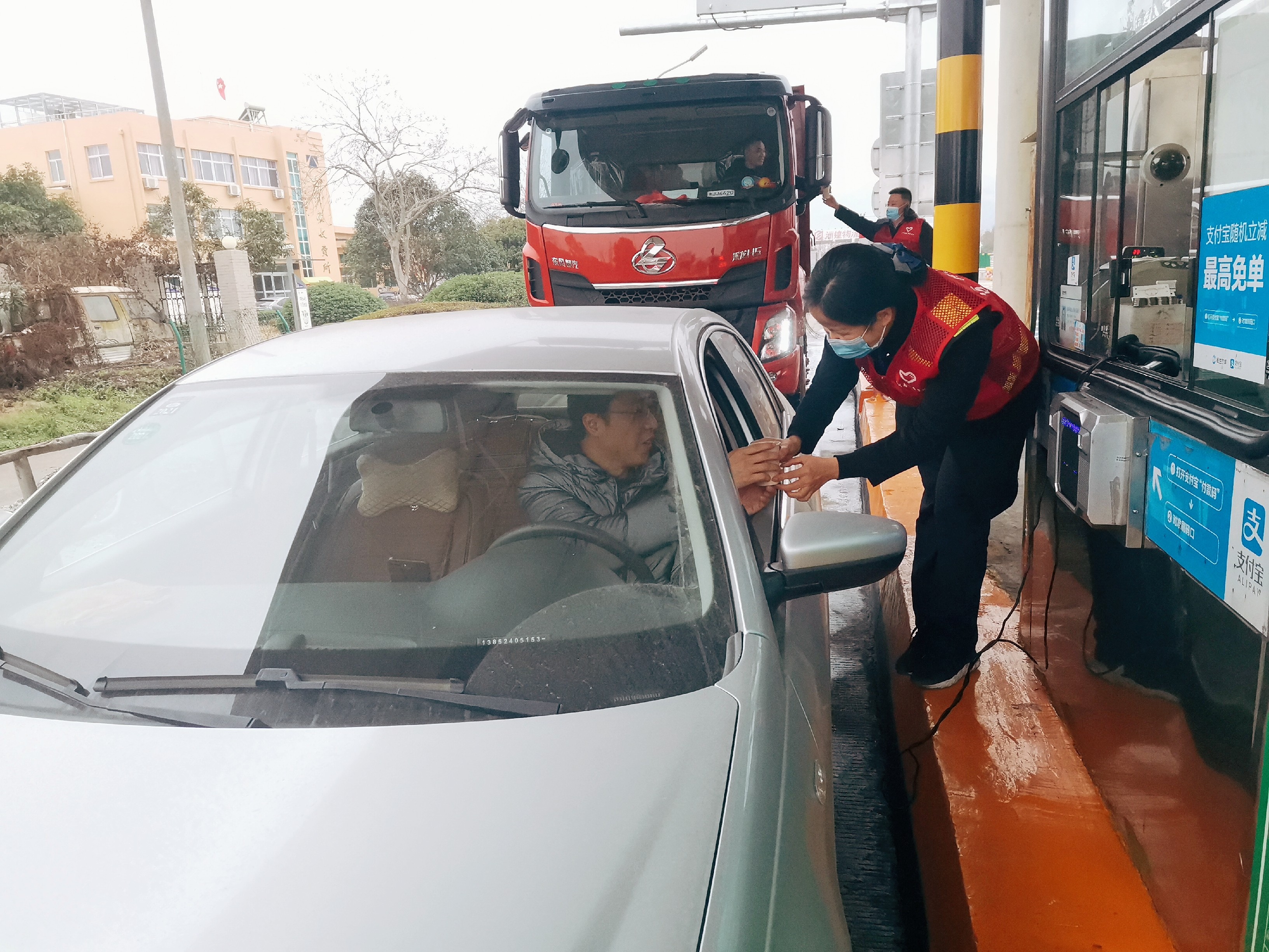 當(dāng)天上午,臺(tái)州各地迎來“2021年第一場(chǎng)雪”,志愿者們身著紅馬甲,在收費(fèi)所崗?fù)ぐ踩珝u上搭起了愛心服務(wù)臺(tái),迎著風(fēng)雪準(zhǔn)備送溫暖用品。10點(diǎn)左右,雪下得大了,寒意更甚,大家在收費(fèi)過道上來來回回,將一杯杯熱乎乎的紅糖姜茶送到過往的司乘人員手中,并告知路況信息,提醒司機(jī)強(qiáng)冷天氣注意行車安全。司乘人員握著姜茶露出友好的笑容,令大家感受到了溫暖的力量。