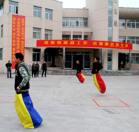 圖為“跳袋鼠”比賽 上午9點整,隨著臺州收費所所長、分工會會長王小勇的一聲令下,趣味競技活動正式拉開帷幕。此是自分工會成立以來第一次組織的妙趣橫生的集體活動,參加人員個個摩拳擦掌、躍躍欲試,有的迫不及待地在一旁先練開了。 此次趣味活動本著“重在參與、愉悅身心、全民健身”的原則,以豐富員工健康向上的業余文化生活為目的,分集體和個人兩種比賽方式。集體項目有“二龍戲珠”、“齊心協力”、“我是喬丹”、“集體跳繩”共4項;個人項目有“絕對公平”、“夾豆比賽”、“單人跳繩”、“跳袋鼠”、“車輪滾動”共5項。在集體項目中,各隊配合默契,勇往直前;單人賽中,各位員工積極參與,有幾個為爭第一不小心摔倒,手掌擦破了皮,褲子摔破了也絕不放棄,爬起來繼續參加比賽,堅持到最后。